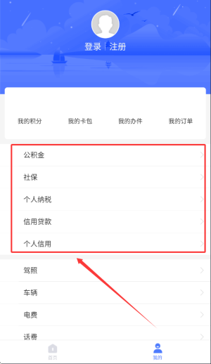 4、个人中心可查询公积金账户详情、社保缴纳记录、个人纳税信息、信用贷款服务及个人信用报告等内容。