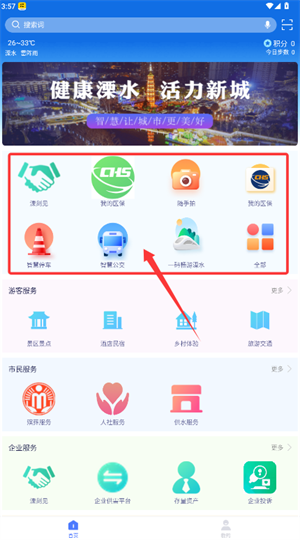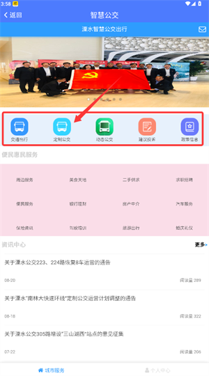 2、成功登录返回主界面,在功能区内定位并进入智慧公交服务模块。