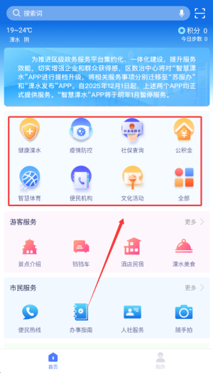 3、首页提供健康溧水服务、社保信息查询、公积金业务办理、智慧体育平台、便民机构查询及文化活动参与等功能入口。