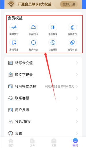 4、个人中心支持实时语音转写、作品同步管理、语音翻译服务、音频编辑修改、格式转换及高级功能解锁。