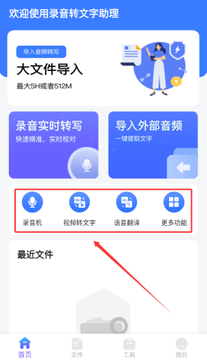 3、首页提供录音机操作、视频内容转为文字及语音翻译等常用音频处理功能入口。