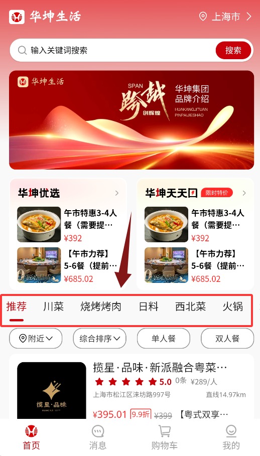 2、首页可按菜系、附近、排名及单人餐等条件筛选餐厅。