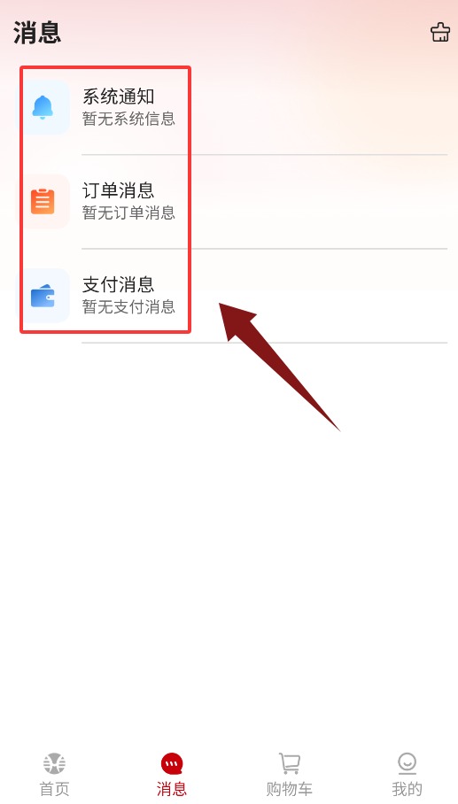 3、消息界面分类显示系统通知、订单消息与支付提醒。