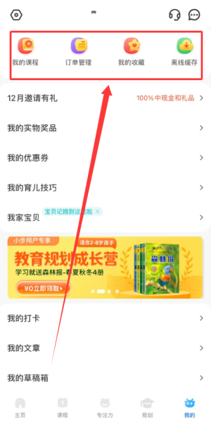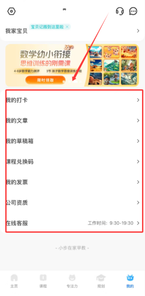 3、该页面同时包含学习打卡记录、个人文章、草稿箱、课程兑换与发票申请等事务。