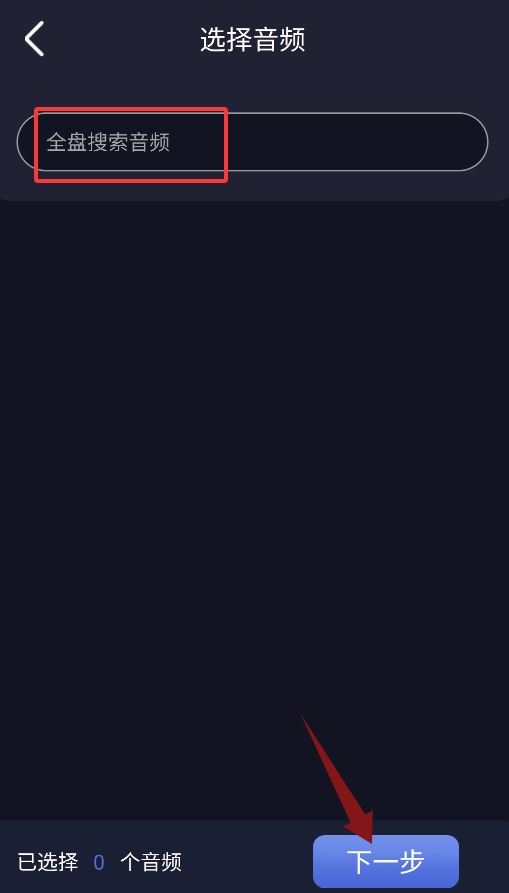 3、在音频选择界面,搜索或选取目标音频,点击下一步编辑。