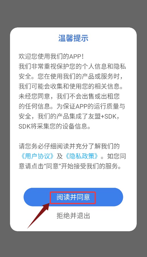 1、首次启动应用需点击确认温馨提示,同意后方可进入主界面。