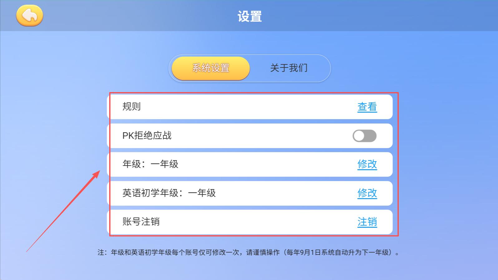 4、可以在设置内选择宝宝的年级,根据不同年纪推荐不同的学习内容。