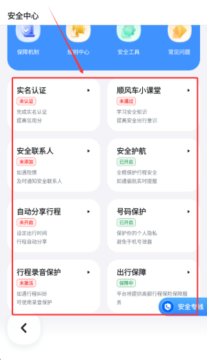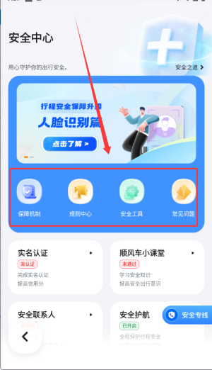3、该区域包含实名认证、紧急联系人设置、行程护航及隐私保护等安全功能。
