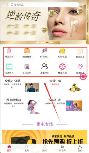 3、首页展示潮流女装、潮流男装、时尚鞋包及活动中心等多个商品分类浏览入口。