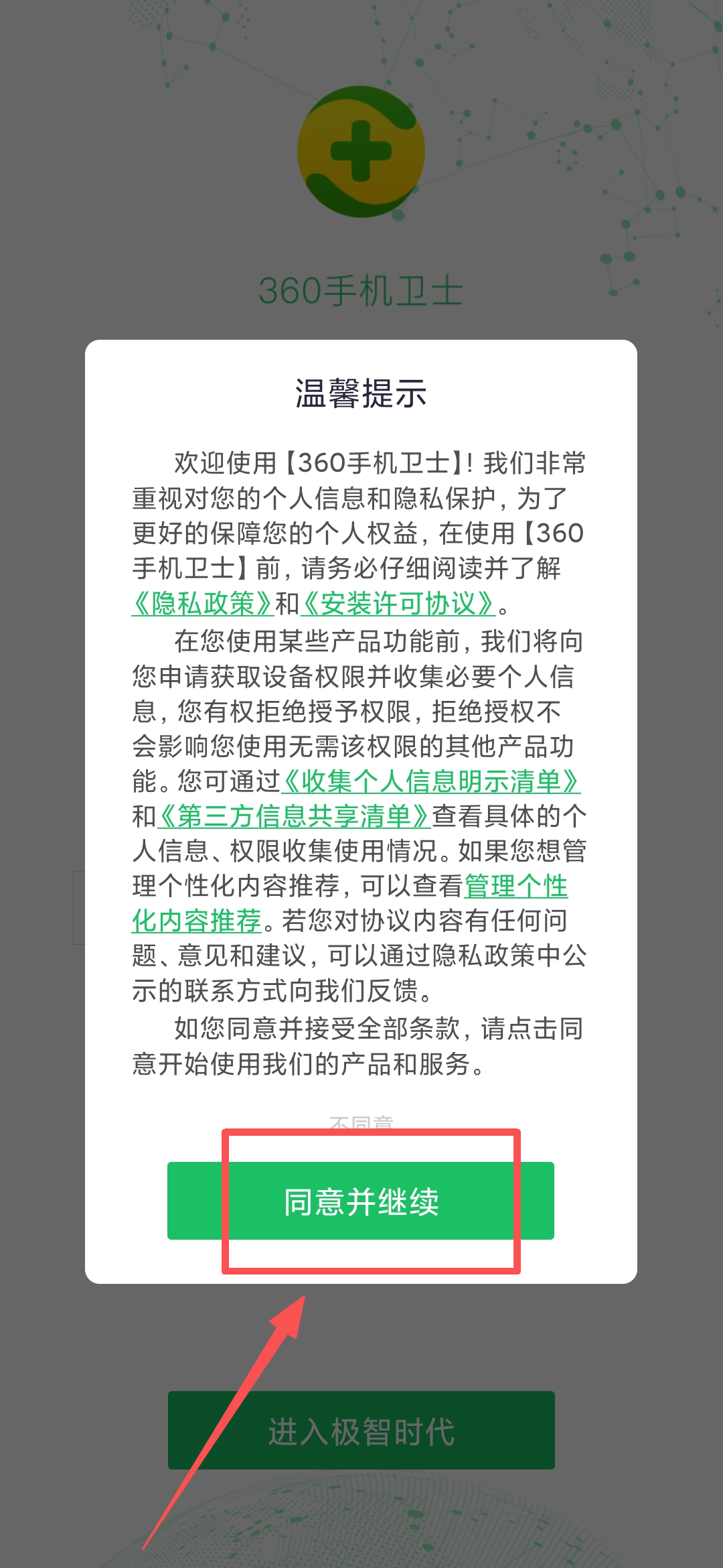 2、在360手机卫士APP中点击"同意并继续",进入程序界面。