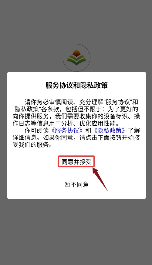 1、首次启动应用需点击同意并接受,确认后方可进入主界面。