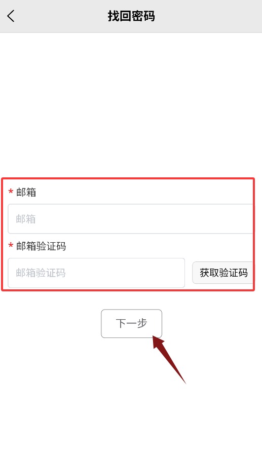 3、找回密码时输入邮箱与验证码,验证后即可设置新密码。