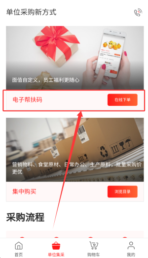 4、单位集采功能可通过电子帮扶码在线完成采购需求提交与订单生成流程。