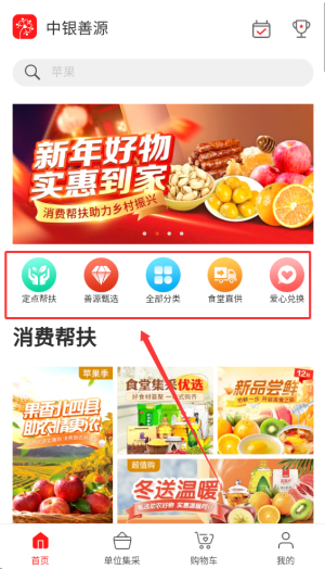 3、首页提供定点帮扶、优质甄选、全部分类、食堂直供及爱心积分兑换等板块。