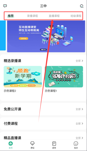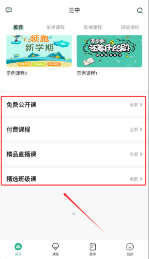 3、首页提供推荐内容、录播课程、实时直播及班级课程等多样化学习资源。
