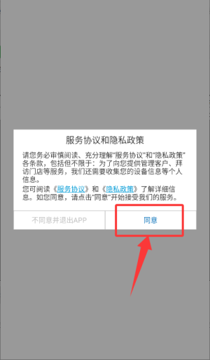 1、启动应用后阅读服务协议与隐私政策,确认后点击同意按钮进入下一步。