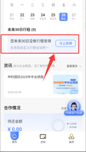 2、进入首页后在行程区域点击马上安排按钮,开启规划操作。