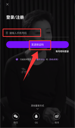 3、在登录页填写手机号码,点击发送验证码获取验证码推进流程。