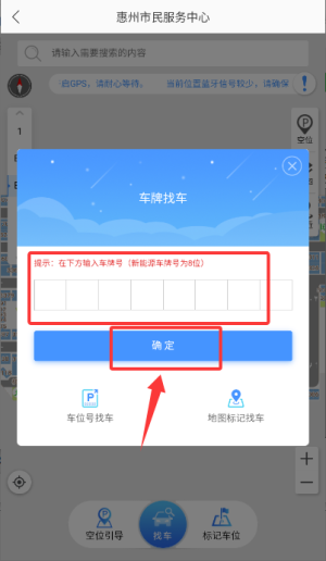3、在车牌找车弹窗填写对应信息,点击确定启动车辆查找流程。