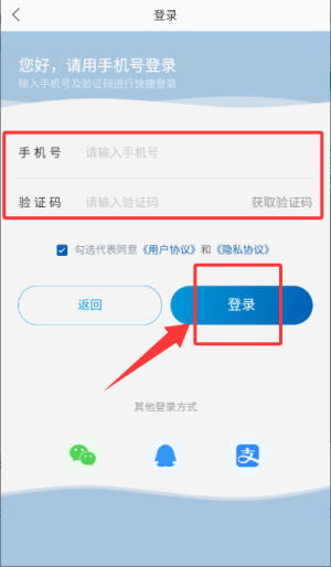 1、在登录页填写手机号与验证码,勾选协议后点击登录完成操作。