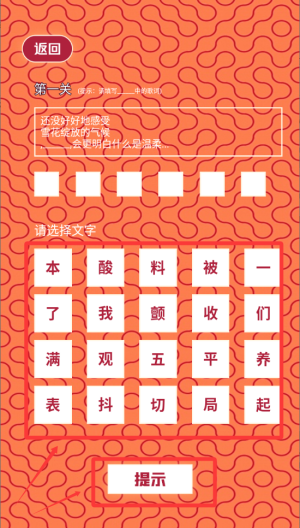 4、根据给出的歌词再下面的文字点击正确的顺序如果不知道的可以点击洗唛那的提示按钮。
