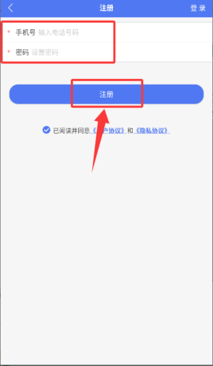 1、在注册页填写手机号与密码,勾选协议后点击注册完成账号注册。