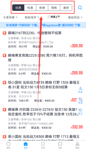 3、接单板块设有优质订单、标准任务、抢单模式、陪练服务及悬赏任务等类型。