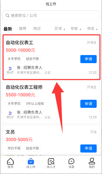 3、在列表页查看岗位信息,点击申请按钮投递简历。