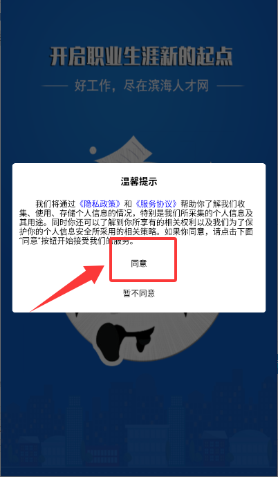 1、打开应用后在温馨提示弹窗内点击同意按钮,确认隐私与服务条款。