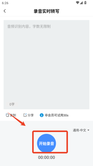1、打开软件后点击录音按钮,开始说话或播放音频,系统会自动实时将语音转换成文字。