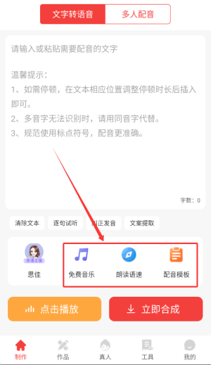 3、制作板块提供免费音乐素材、朗读语速调整及多种配音模板选择功能。