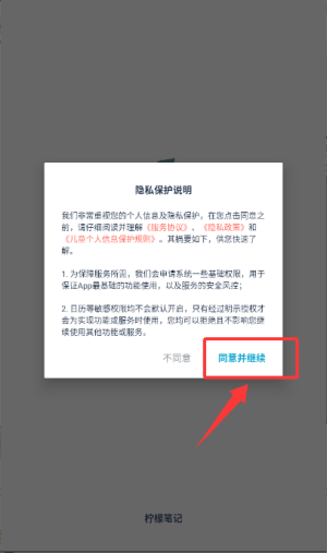 1、打开应用后在隐私保护说明弹窗内点击同意并继续按钮,确认条款。