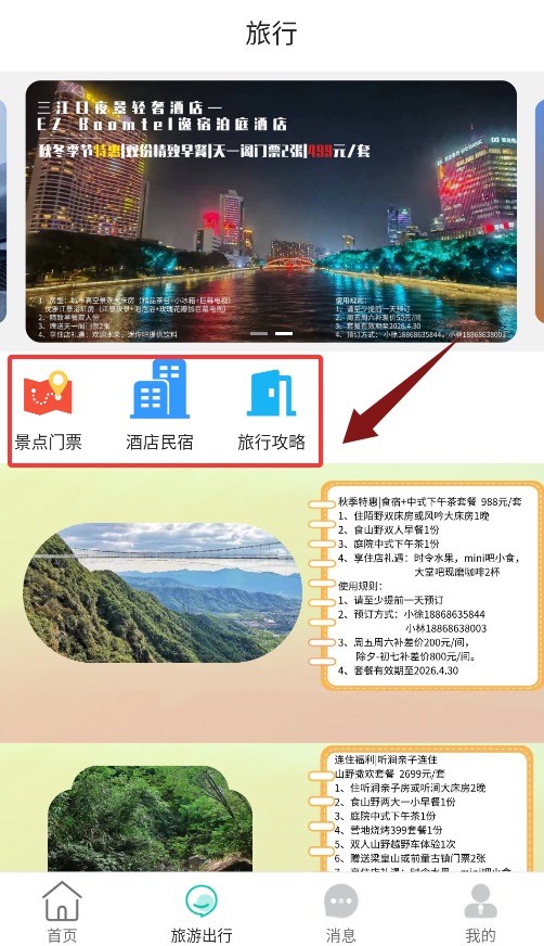 3、旅游出行板块包含景点门票、酒店民宿与旅行攻略预订。