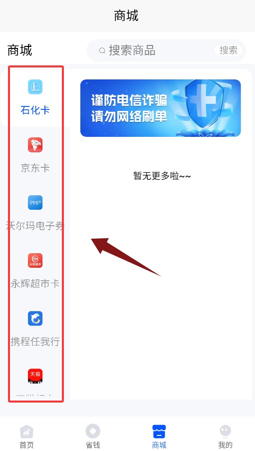3、商城界面可选择石化卡、京东卡、超市卡等各类充值卡券。