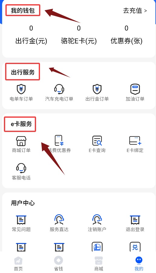 4、个人中心支持管理我的钱包、出行服务与E卡服务等功能。