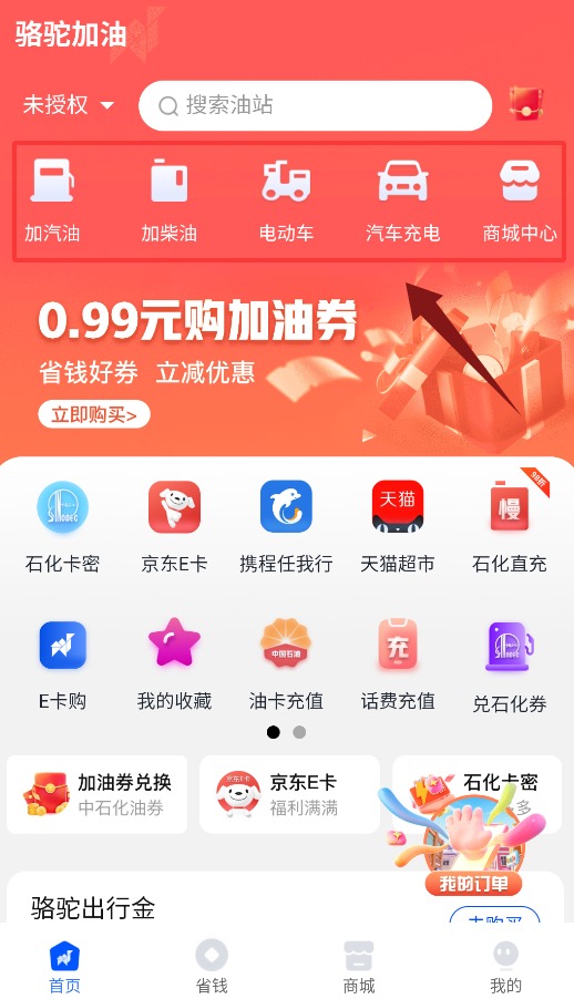 2、首页提供加汽油、加柴油、电动车充电与商城中心等服务。
