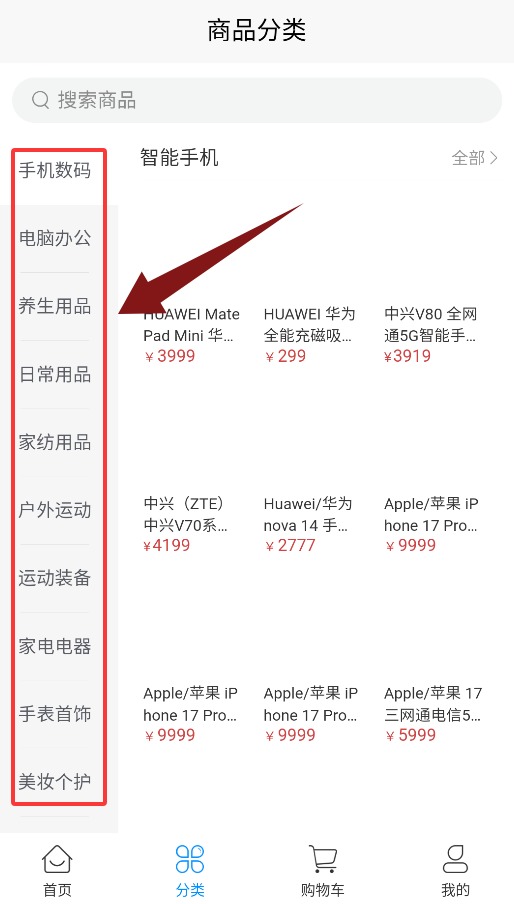 3、分类界面提供手机数码、电脑办公、养生用品等商品快速筛选。