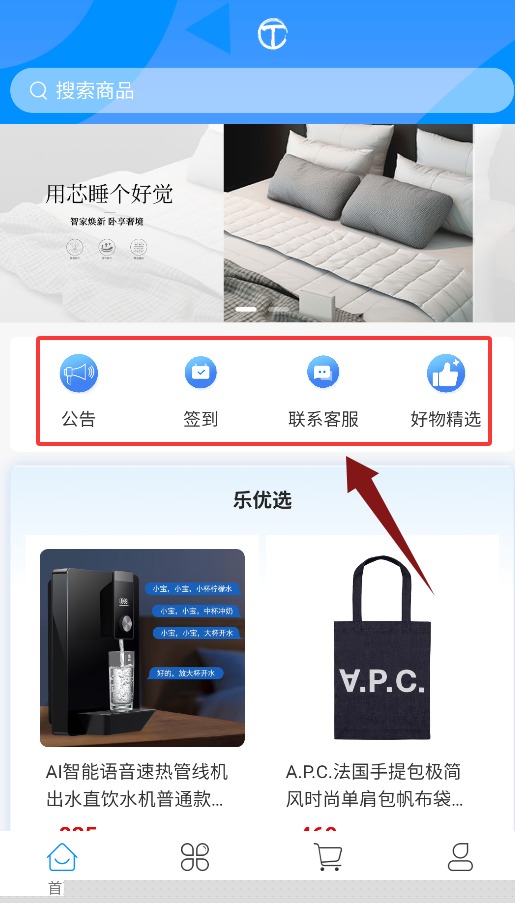 2、首页设有公告、每日签到、联系客服与好物精选等功能入口。