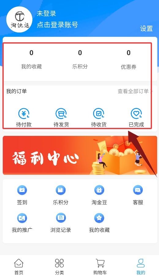4、个人中心可管理我的收藏、乐积分、优惠券及订单全流程状态。