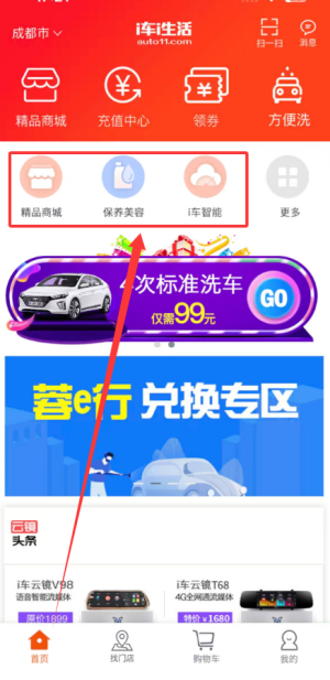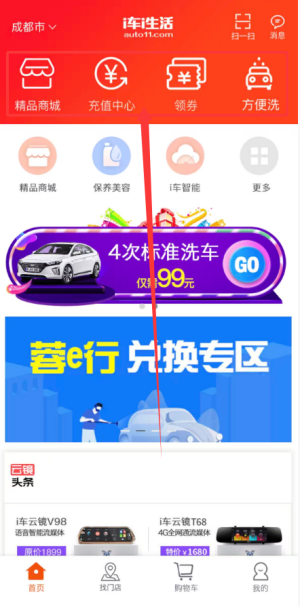 2、首页提供精品商城购物、话费流量充值、优惠券领取及快速洗车预约等功能入口。