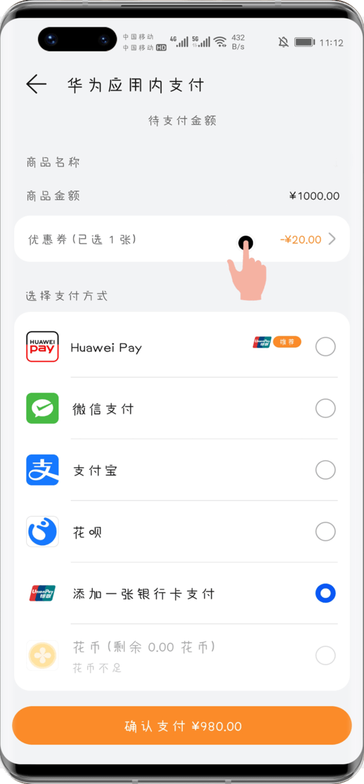 在应用内付费界面选择华为钱包安全支付 > 优惠券,勾选可用的优惠券支付,优惠券可与其他支付方式(花币、银行卡、支付宝、微信等)组合支付。