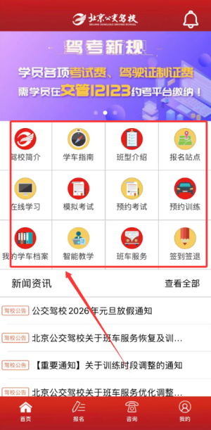 3、首页提供驾校简介、学车指南、班型介绍、报名站点查询、在线学习及模拟考试等功能。