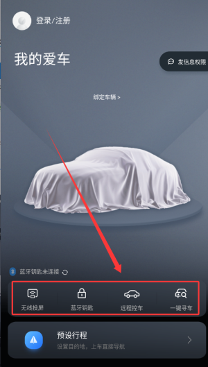 3、主页提供无线投屏连接、蓝牙钥匙启用、远程车辆控制及一键寻车定位等功能。