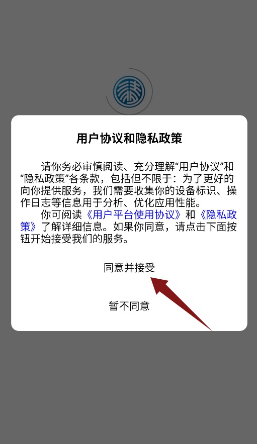 1、应用启动时会显示使用协议,需点击同意并接受后才可进入。