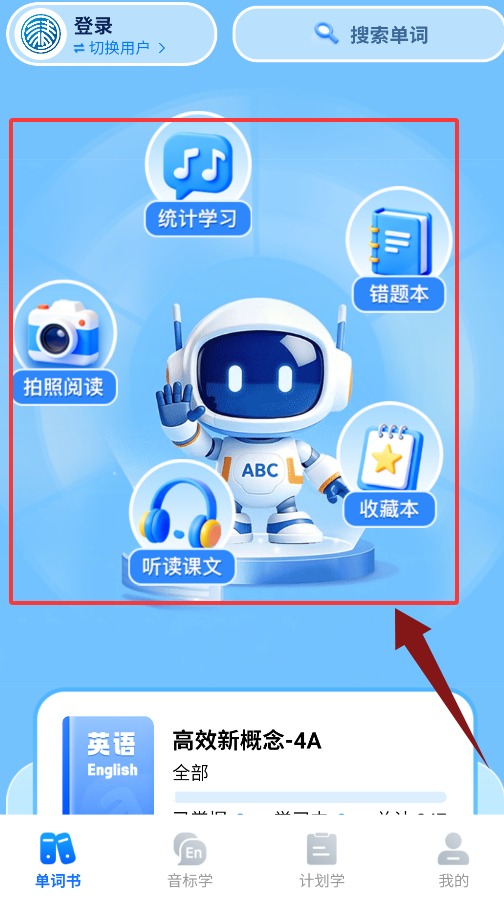 2、单词书页提供学习统计、错题本、拍照阅读、听读课文等功能。