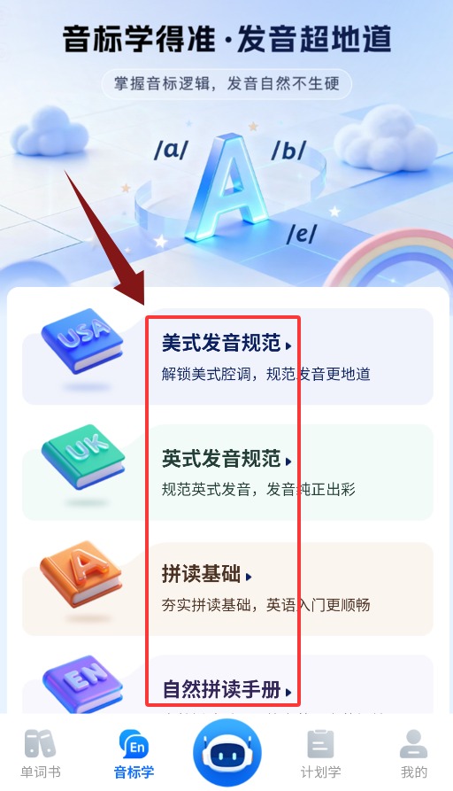 3、音标学习模块包含发音规范、拼读基础与自然拼读手册等内容。