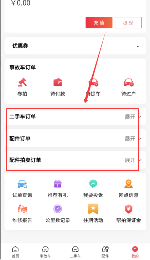 4、我的页面集中管理二手车交易订单、配件购买订单及配件拍卖订单等各类交易记录。