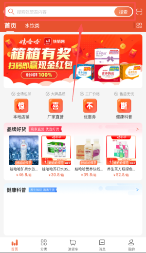 3、在首页可通过搜索框查找内容,或浏览品牌好货板块选购水饮商品。