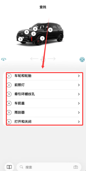 2、查找功能涵盖车轮轮胎规格、前照灯调整、牵引环位置、车前盖开启及雨刮器更换指南。