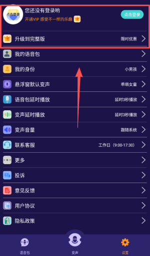 3、如果想登录或开通VIP,点击右上角头像按提示完成,可解锁更多语音包和完整功能。